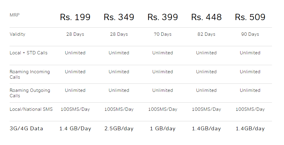 Unltd calls, 3GB data and 100 SMS/day Unlimited Pack, validity 28 days Rs 398