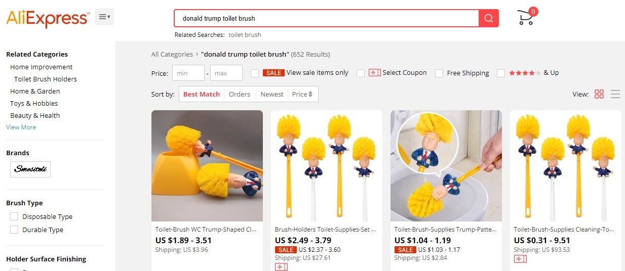 - Around 296 sellers are selling the ‘Trump Toilet Brush on AliExpress. If you want to clean your toilet with a brush having the face of the US President, you can buy it.