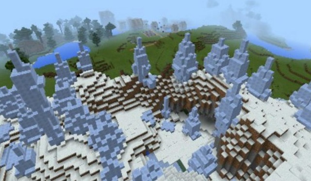 There are lots of spawn locations that have greenery surrounding you but the Icy Tundra allows you to spawn in a white valley. You will be in a field of towering ice spikes near a small riverside village. You can go on your own Frozen-esque adventure.