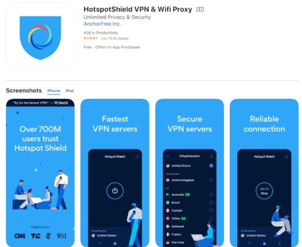Hotspot Shield is a well-known VPN service provider for all the major platforms. The iOS app has an average rating of 4.5 stars on the App Store. This VPN provides servers from over 70 locations across the globe. It is one of the fastest, simplest, and most secure VPNs available on the web. It offers military-grade encryption for the shared data between servers and the device. And, it also follows a no-log policy that can help you stay private online.