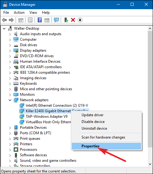 - Now right-click on the network interface for which you want to change the physical address and choose Properties.