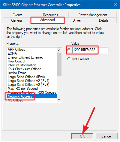 - Next, switch to the Advanced tab on the Properties window. Then, select Network Address from the Property list. Check the Value option and enter the custom MAC address without any dashes or colons.