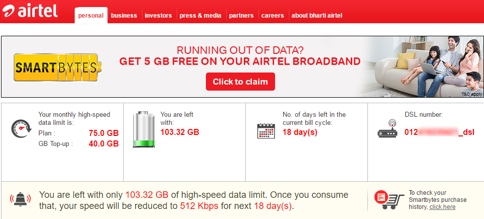 If you are an Airtel Broadband customer, here is some good news for you. Airtel provides a very simple, quick and efficient way to track your monthly data usage, effectively planning your usage and making it last longer. Airtel Broadband subscribers can use the online service provided by Airtel. This allows you to check data usage and recharge or replenish data when it runs out. This online service is called Smartbytes.