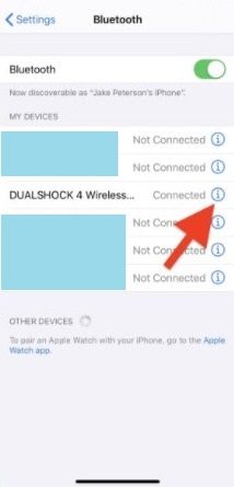 Step-2: Find ‘DualShock 4 Wireless Controller‘ under the My Devices section. Tap on the ‘i’ button present next to it.