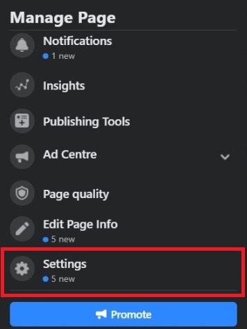 Step-3: Next, find and click on ‘Settings’ under the ‘Manage Page’ section present on the left side of the screen.