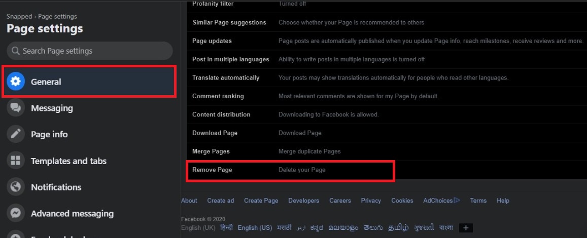 Step-4: Next, scroll down, find, and click on the ‘Remove Page’ option on the right side of the screen from the General tab.
