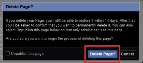 Step-6: Now, click on ‘Delete Page’ on the next prompt. You can also check the ‘Unpublish this page’ box while doing this, so the page is removed instantly from other user’s newsfeeds.