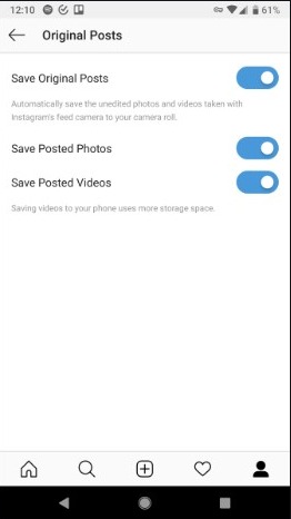- Then, turn the toggle switch present next to Save Original Photos or Save Original Posts to On position.