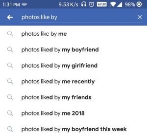 You can check all the photos liked by anyone in your Friend list by a simple Facebook search. Go to the Facebook search bar, type ‘Photos liked by’ followed by the name of the person. You can even filter the result by adding ‘this month,’ ‘this week.’ ‘today,’ etc. Facebook will tell you about all the photos that he/she liked in that particular period of time.