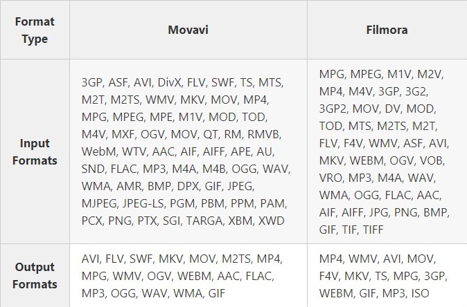 Both Filmora and Movavi support all mainstream input and output formats. Recently, Movavi has added support for some additional formats as well. So, Movavi now offers support for more formats than Filmora. Here is a comparison chart of all formats supported by Movavi and Filmora.