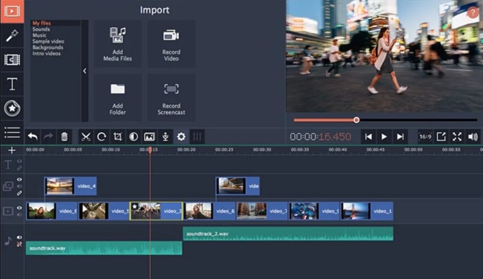 On the other hand, Movavi Video Editor also has all the essential features. It lets you cut and merge clips, add filters, transitions, and titles. There are special effects like Slow-mo, Chroma-key, Reverse, etc also available. It even provides intro and outro videos to make your videos complete. It has separate tracks for audio, video, text, and effect on the timeline. You can add them according to your needs. You can also link the tracks so the audio and video sync will not be disturbed.