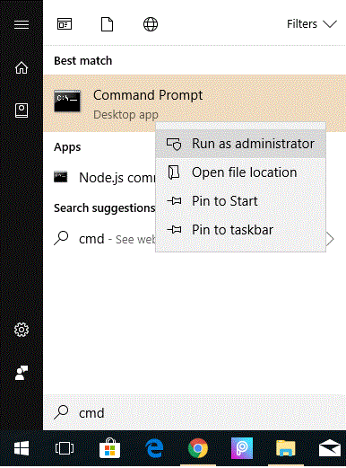 - Click on Windows icon and type “cmd“. Right click on Command Prompt in the list and choose Run as administrator.