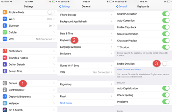 - Step 3: In the Keyboard menu, you will find the Dictation option. Press the toggle button to off/on the Dictation option.