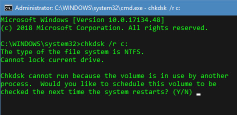 Step 4: After completing the check disk, it will ask you a question regarding checking the disk when the system restarts. Press Y for yes so it can check next time it restarts.