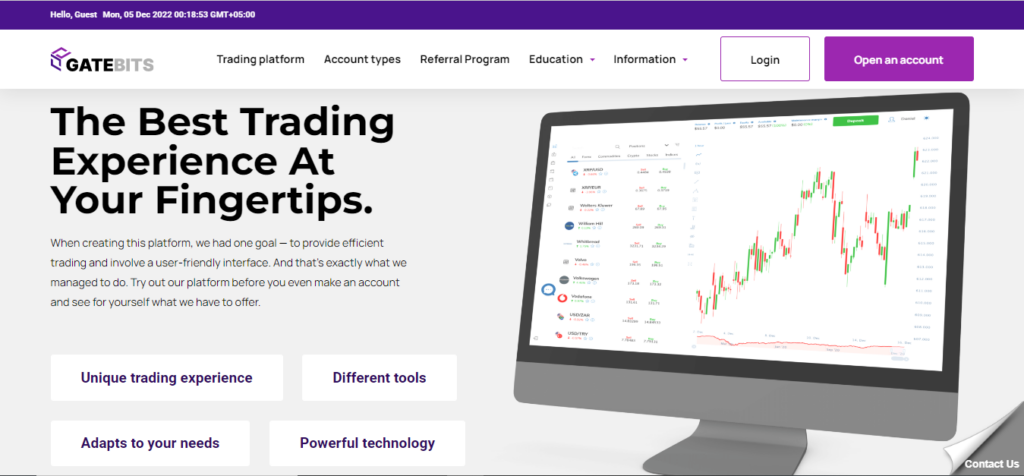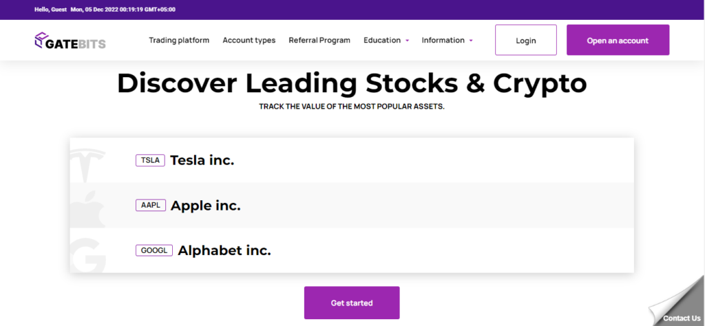GateBits is a secure and user-friendly platform that allows you to easily trade stocks, bonds, and other tradable assets. It also allows traders to invest in a variety of other products, including such as cryptos. The platform is designed to make trading quick and easy, with an intuitive user interface and a variety of features to help you manage your investments.