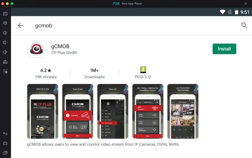 Step-4: Then, launch Play Store in Nox, and search ‘gCMOB.’ You will find the app in the first place in the results. Next, click on the ‘Install’ button present with it to install gCMOB.
