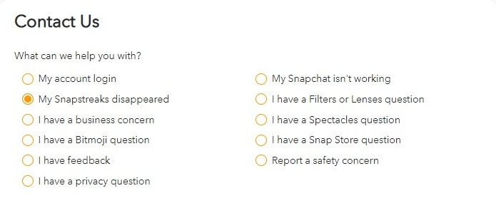 Step-2: Now select “My Snapstreaks disappeared” as the topic for help under the ‘Contact Us’ section.