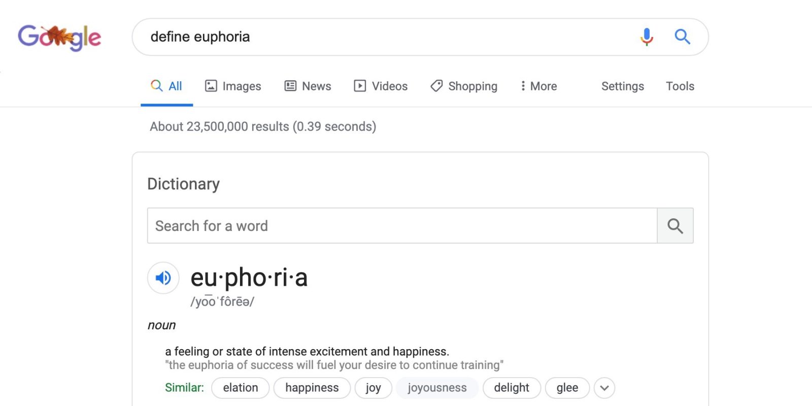 You can get the definition of almost anything using Google. Just type the word in the search bar with the word ‘define’ before it and Google will present to you a definition of that word in the results. For example, type ‘define euphoria’ to find the definition of euphoria. It is a fun and very useful trick for scholars.