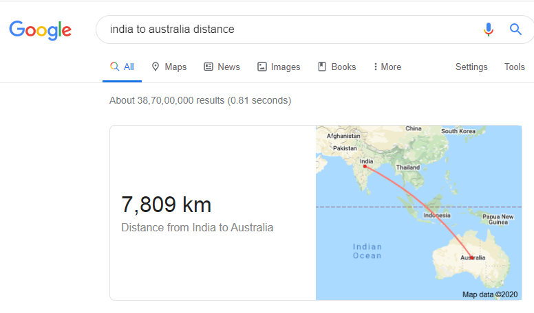 You can find the distance between two countries or two cities using Google. For example, type India to Australia Distance and Google will come up with the total distance in results. Or, you can type the name of two cities and Google will tell you distance and also the time it takes to cover it.