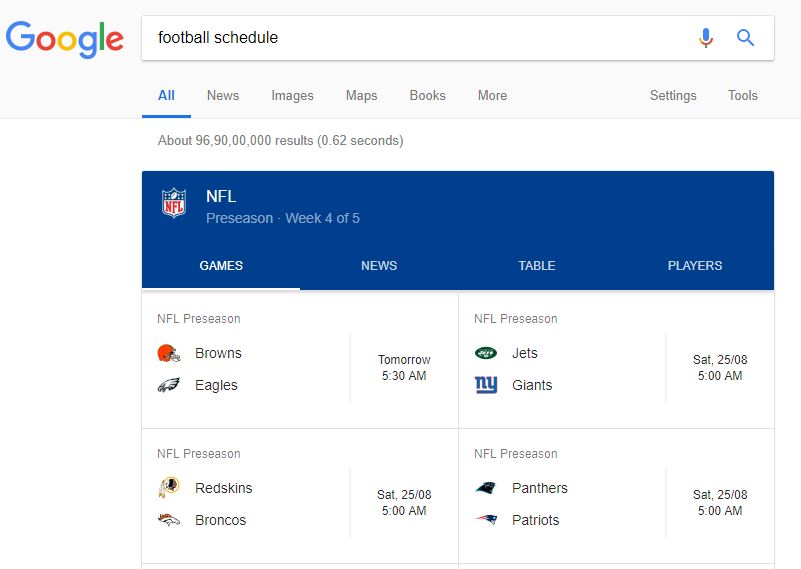 If you follow any sport very closely and don’t want to miss any match, you can always rely on Google. You just have to type the name of the sport followed by the word ‘schedule’ and Google will show all the upcoming matches. For example, type ‘football schedule’ to know about all the upcoming football matches. Also, you can find schedules for particular tournaments like NFL, NBA, IPL, etc.