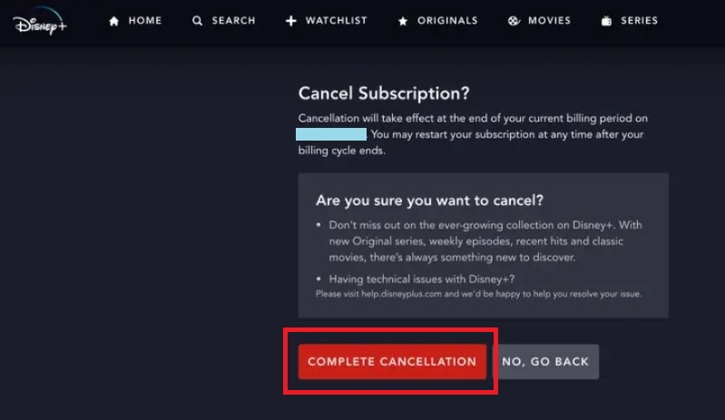 Step-8: Finally, click on ‘Complete Cancelation‘ to end your current relationship with Disney Plus.