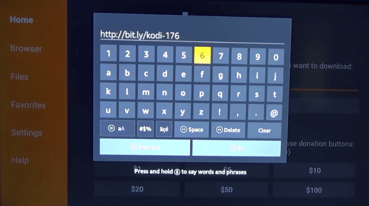 - Press the OK button on your remote to enter the URL http://bit.ly/kodi-176. Click on Go.