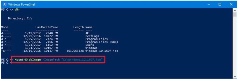 - Command: Mount-DiskImage -ImagePath “C:\FILE.ISO”