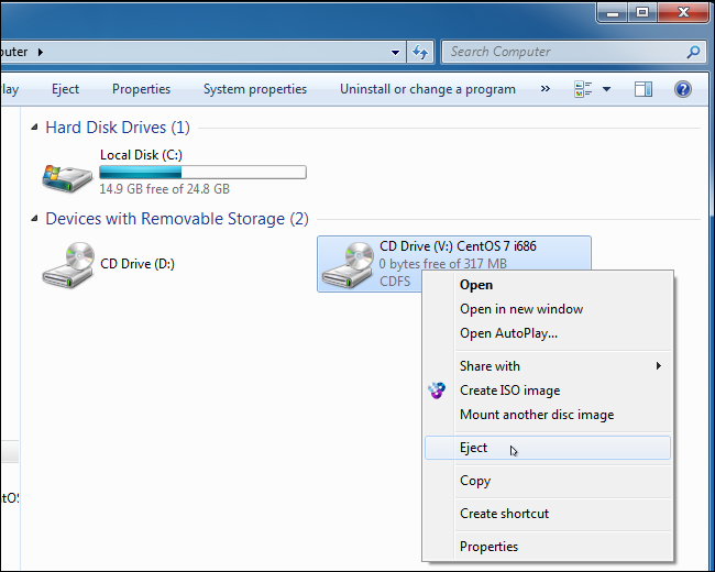 - You will then see the virtual disc drive present next to your CD Drive. Just right-click on the virtual disc drive and choose Eject. This will unmount the file from your computer.