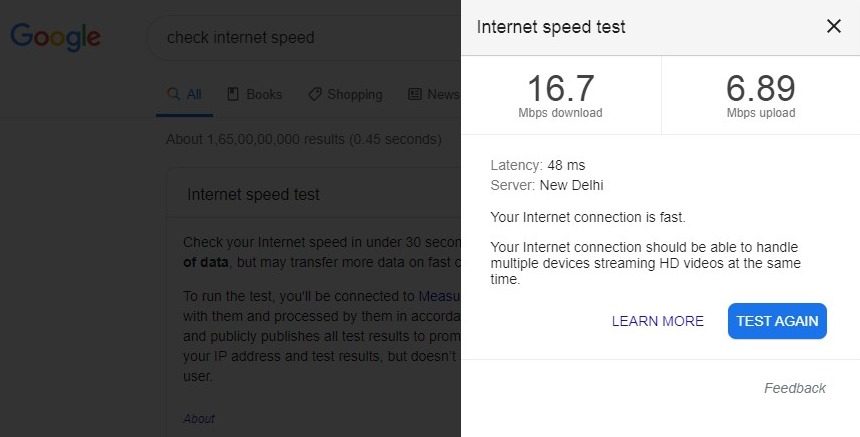 To check your internet speed, you can simply type ‘Check Internet Speed‘ in the Google search bar and then click on the ‘Run Speed Test’ button. You can also use third-party internet speed test websites to do that.