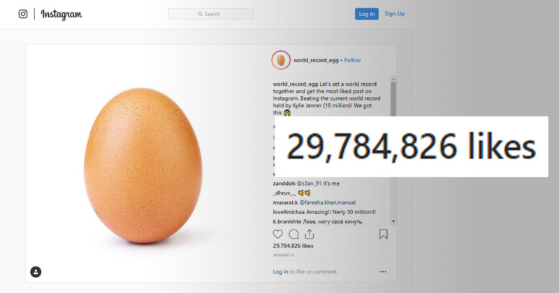- A picture of an egg posted by @world_record_egg is the most liked photo on Instagram having over 53 Million likes. It surpassed the previous record of 18 Million likes on a post from Kylie Jenner on 14 January 2019.