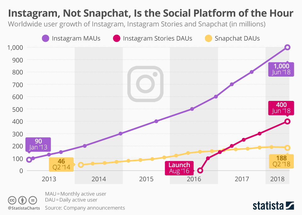 - Instagram has more than 1 Billion active users monthly, while Snapchat has only 310+ Million monthly active users. It will take some time more before Snapchat reaches up to Instagram here. Instagram has an edge over Snapchat here.
