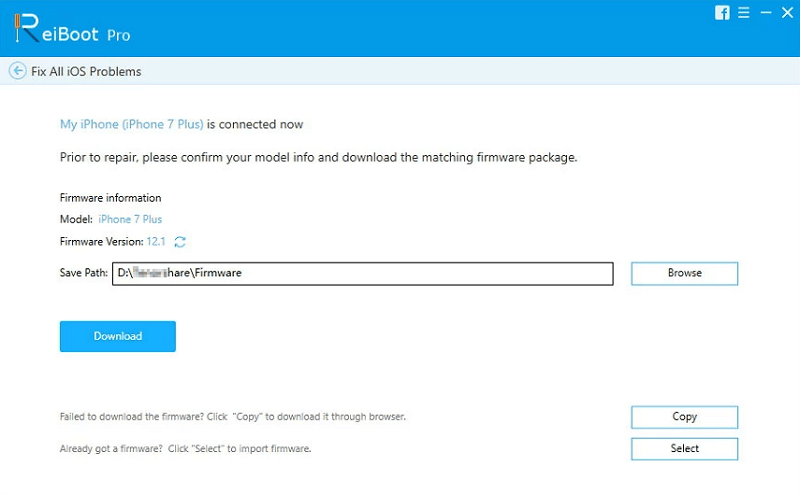 Step 2. Click on start and then repair, you will be asked to download a firmware package that is suitable for your iOS system.
