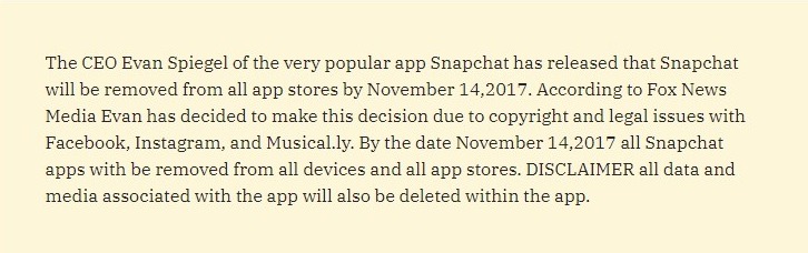 Every year, a lot of rumors roam the internet about popular apps like Snapchat, TikTok, etc shutting down due to various reasons. 90% of the times they are proven false and the apps don’t close. This Snapchat shutting down rumor is also false and Snapchat will NOT shut down in 2020. The origin of this rumor dates back to the summer of 2017 when a ‘prank news website’ posted it. Channel45News.com posted that Snapchat will shut down on November 14, 2017. Here is what they wrote.