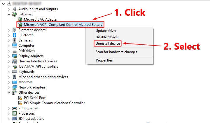 - Under Device Manager, go to Batteries > Microsoft ACPI-Compliant Control Method Battery.