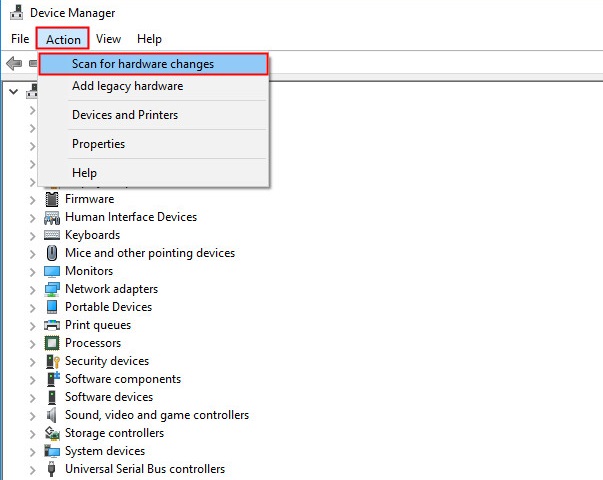 - Then, go to the Action tab and scan for hardware changes. Wait for a while as Microsoft ACPI-Compliant Control Method Battery will be installed again.