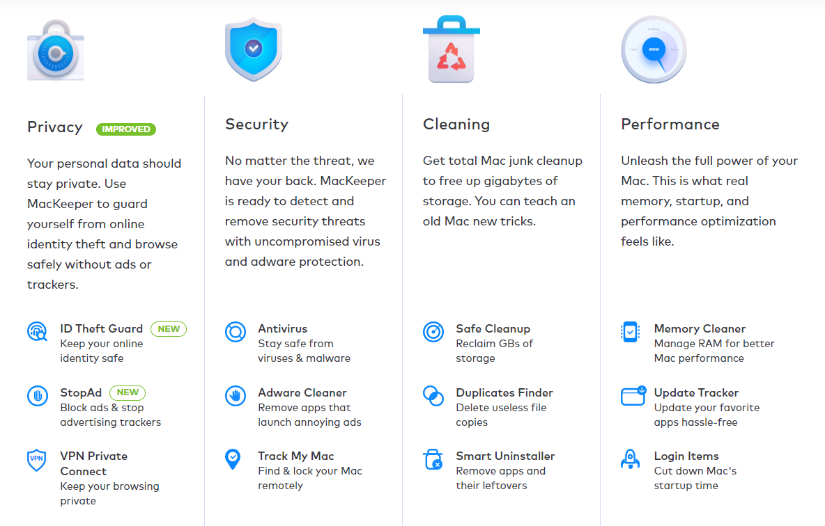 The basic feature of Mackeeper is to enhance the performance of macOS by doing several exercises like securing & eliminating unnecessary & harmful files from the system. Besides, it provides you with an enchanting user-interface that makes it a must-have tool for your Mac. Let us have a closer look at the features offered by Mackeeper.