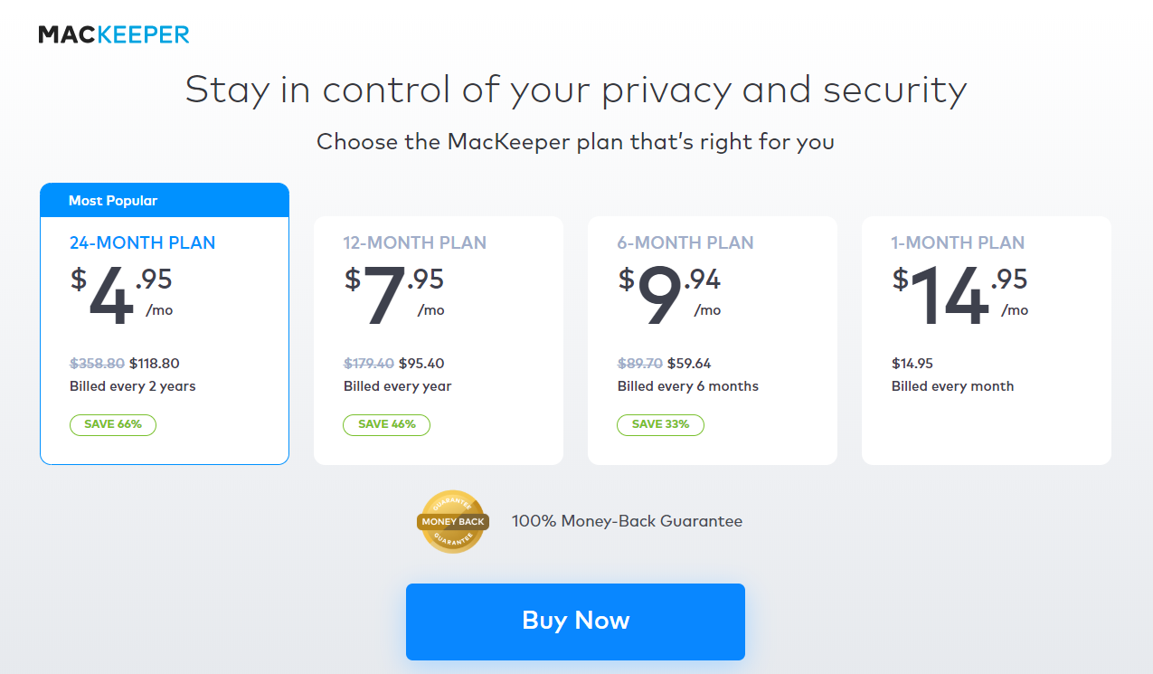 Mackeeper offers a 14-day money-back guarantee with all the pricing plans— means you get a 100% refund if you are not satisfied with the software. I have attached the pricing screenshot below, and I recommend choosing the long-term (24 months) plan because it is the most affordable & economical option for you.