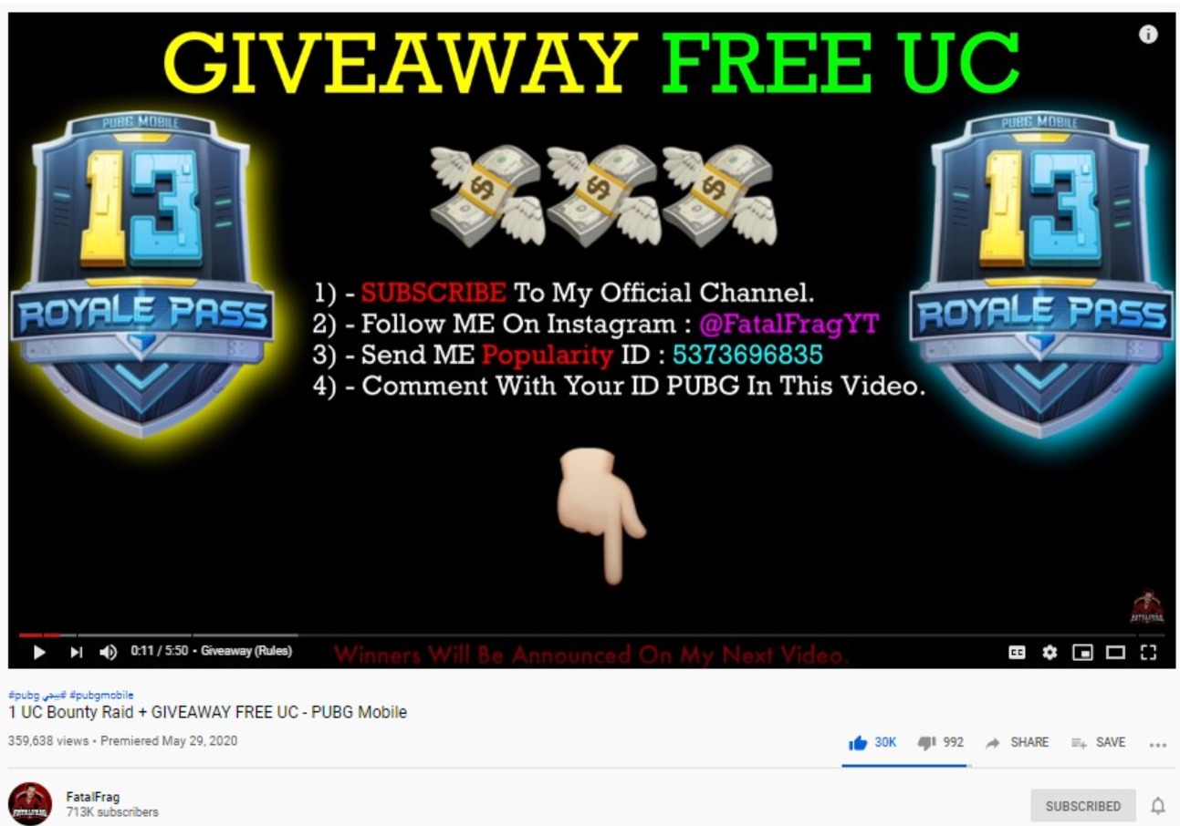 Some examples are Fatal Frag, MrCyberSquad, ClassifiedYT, etc. You can search for ‘UC Giveaway’ and you’ll find plenty of people giving away rewards.