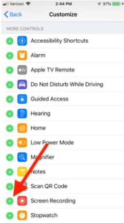 - Now tap on the green plus sign present next to Screen Recording.