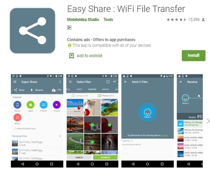 Easy Share is another file transfer app that allows you to share files using Wi-Fi P2P. You will not need the internet for that. It allows you to share any type of files including pictures, videos, apps, music, or documents. It offers a good transfer speed that is around 20MB/s-25MB/s. You can also use it to transfer files to your PC by using the FTP server.