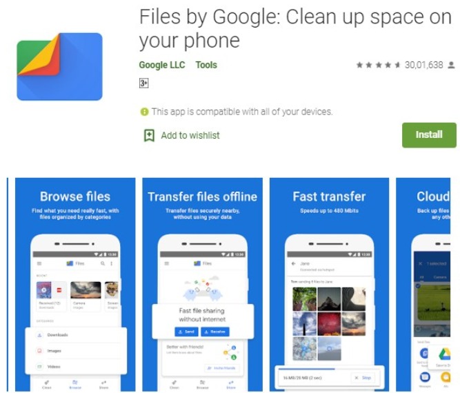 Files by Google is Google’s official File Manager and File Sharing application. Being an official Google tool, there is nothing you should worry about it. It is free and very simple to use. The app doesn’t contain any adware, spyware, or bloatware. It even helps you to clean up the storage and makes space on your device. You can use it to share images, videos, songs, documents, and apps to nearby devices without needing the internet.