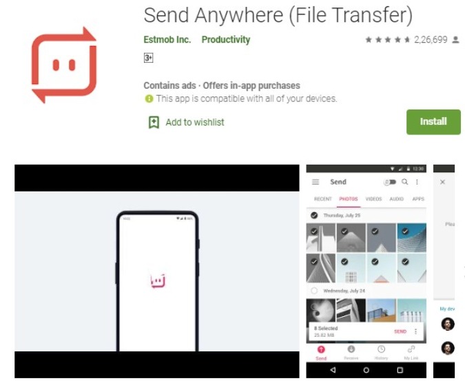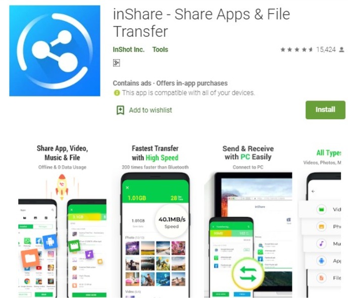 inShare is a well-known and reliable file transfer app by inShot Inc. This app allows you to transfer apps, images, videos, music, e-books, PDFs, and other documents to other devices in the blink of an eye. It calls itself the fastest file transfer app in the Play Store with speed up to 40MB/s. This means that you can share videos of around 1 GB in only 30 seconds. You can also use it to share multiple files or to share it with multiple users.