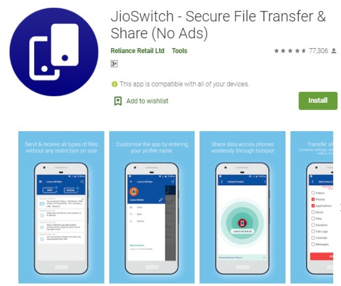 JioSwitch is an Indian file sharing application by Reliance Retail Ltd. Jio has launched a lot of apps for every purpose for Android users and this app is one of them. It is free to use and contains no ads. The user interface is very clean and simple. You can even use it to transfer files between Android and iOS. The transfer speed is also great.