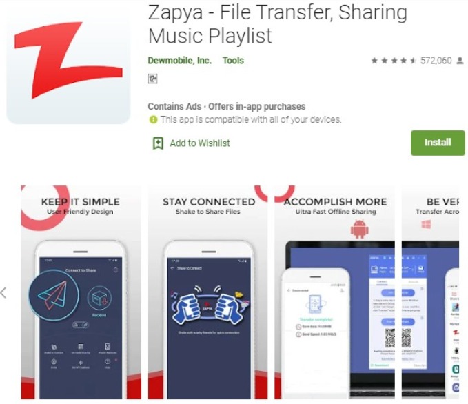 Zapya is a multipurpose file sharing app available for multiple platforms. You can use it to send any format of files including images, videos, audio files, documents, apps, and more to any nearby device. The offline file transfer speed is incredible. Other notable features of this app include creating and sharing personalized playlists, chatting with nearby friends, and remotely controlling your PC.