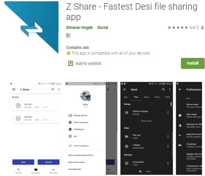 Z Share is an Indian file sharing app that claims itself as the ‘fastest Desi file sharing app.’ This app is developed by Shravan Hegde, a 21-year old BCA student to support the #BoyCottChina movement in India. You can use this app to send any format of file including images, videos, music, apps, and documents across your devices.