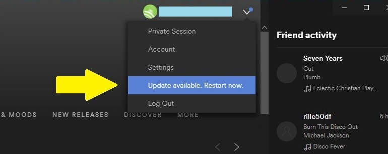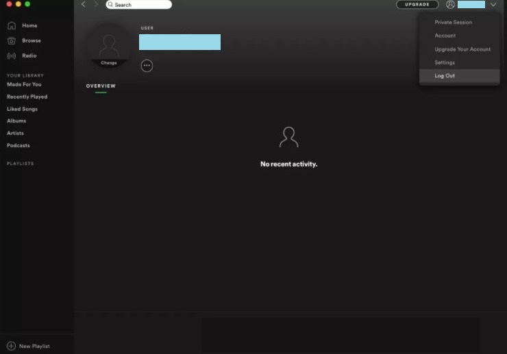 On Spotify Desktop: Click in the dropdown arrow present next to your name at the top right corner. Then, click on ‘Log out’ and then log in again.