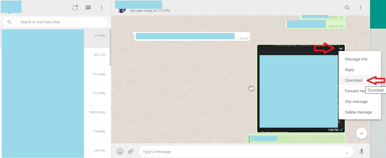 Step-4: If you have received the pictures on WhatsApp, then you can directly open the chat in WhatsApp web. Find the picture you want to transfer, click on the ‘Down arrow’ present on it, and then click on the ‘download’ option. The picture will be downloaded to your PC.
