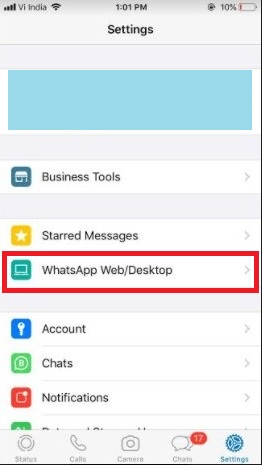 Step-1: Open WhatsApp on your iPhone, tap on the ‘Settings’ icon present on the bottom-right corner of the screen. Now tap on WhatsApp Web/Desktop from the settings.