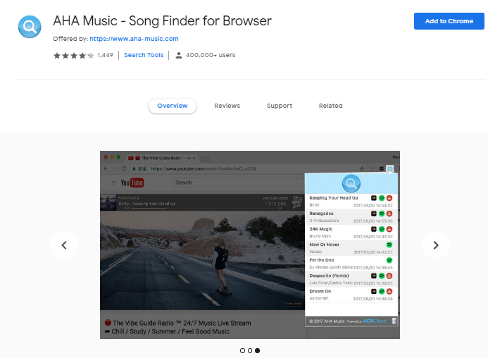 AHA Music is a browser extension that works as a song identifier. You can use it to identify any song you want. Just add it to your browser and click the button of this extension on a page with the audio playing. Then, it’ll start listening to the audio and will recognize it in a few seconds. After that, you’ll have the name and other information about the song you played.