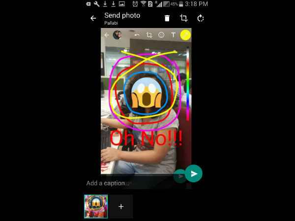You can actually edit your pictures using emoticons, texts, and doodles before sending them. Open a chat, tap on attach, and then choose the picture from the gallery. The image will load in a photo editor. Here, you can add exciting emojis, or texts, doodles, or all of them to make them look more beautiful.